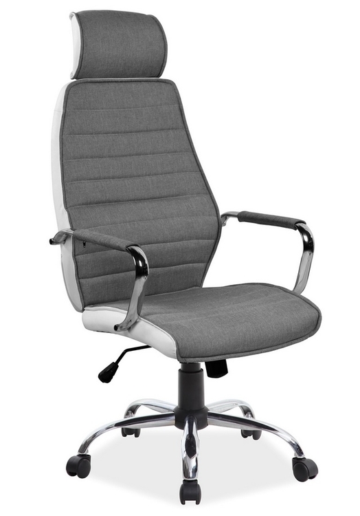 Otáčecí kancelářské křeslo s opěrkou hlavy, kovový podstavec je pochromovaný, čalounění je z látky šedé barvy, po stranách je lemování z bílé ekokůže. Nastavitelná výška sedadla je v rozmezí 46 – 56 cm. Celková výška je 121 – 131 cm.CASA 11559