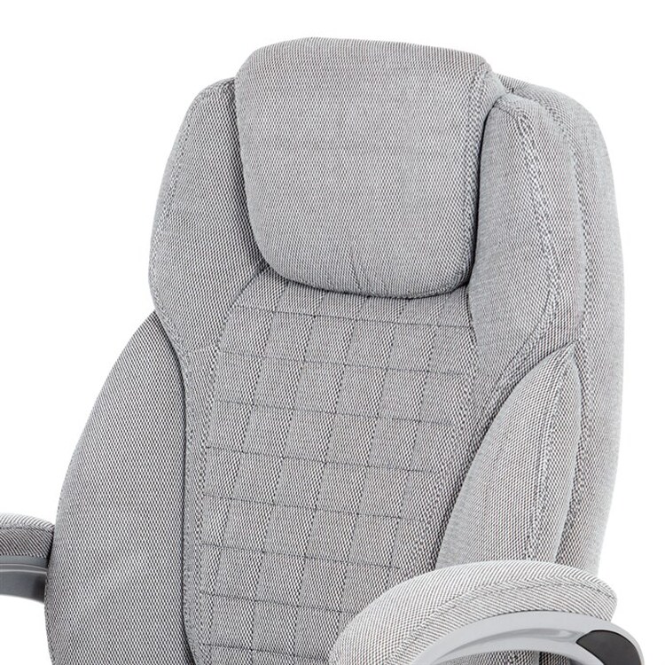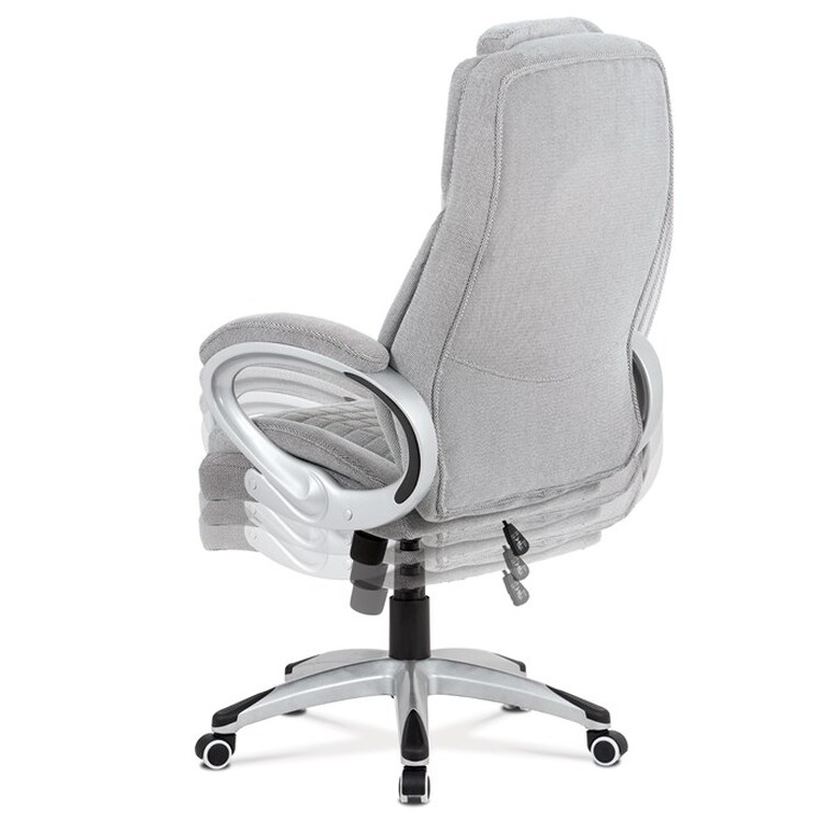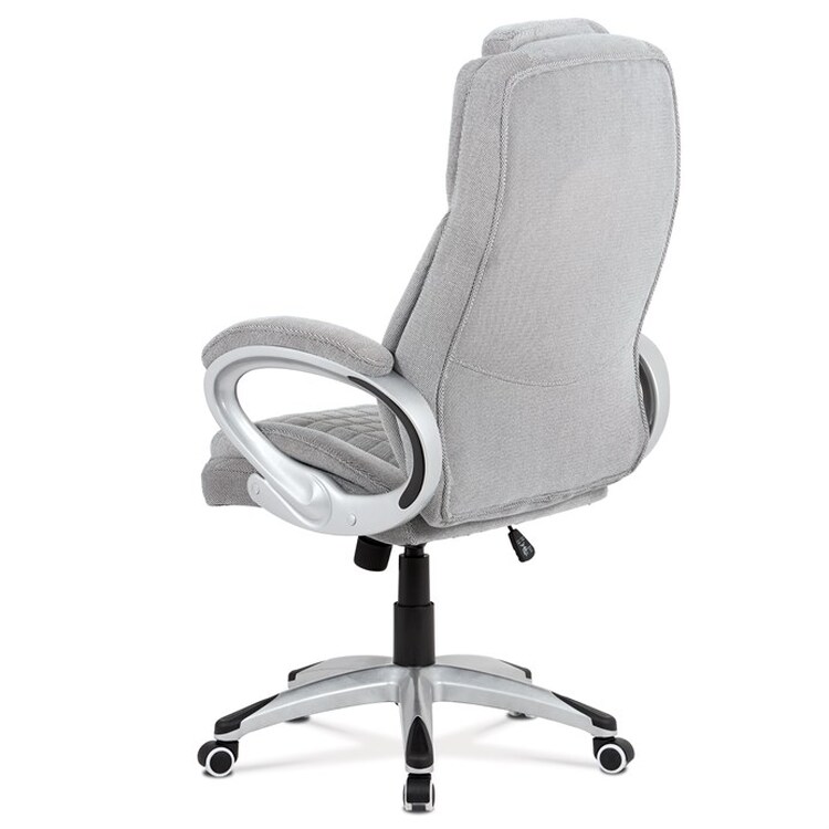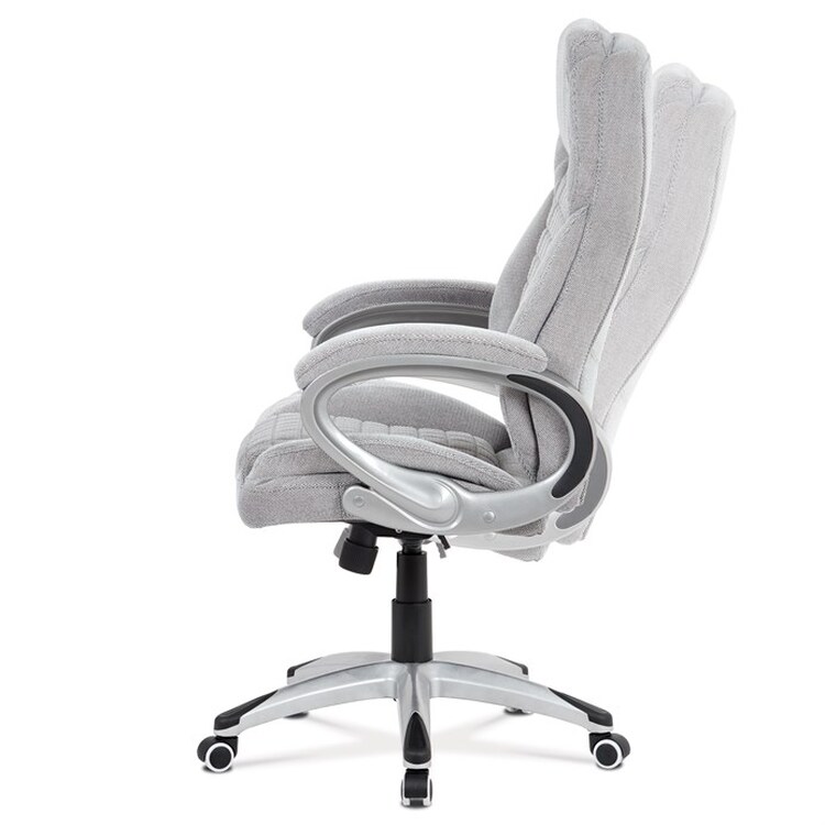 Kancelářská židle v šedé látce nabízí komfortní sezení díky houpacímu mechanismu s možností výškového nastavení. Čalouněné pevné područky s vyměkčenou vrchní částí zajišťují pohodlí při delším používání. Sedák a opěradlo jsou zdobeny designovým prošitím, které zároveň přispívá k estetice židle. Plastový stříbrný kříž poskytuje stabilní základnu s kolečky pro snadnou mobilitu. Židle je vhodná pro kancelářské prostředí, kde je kladen důraz na komfort a funkčnost.