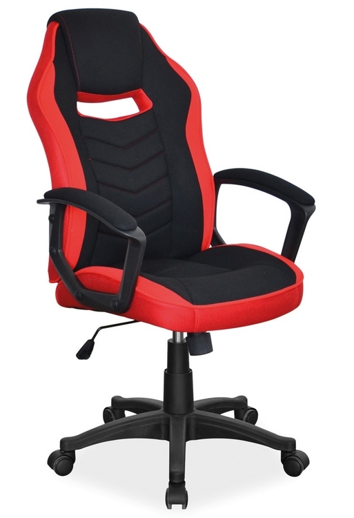 Moderní otáčecí kancelářské křeslo s možností nastavení výšky sedadla. Podstavec je z kovu, čalounění je z látky v černé a červené barvě. Kolečka jsou kaučukové. Výška sedadla je v rozmezí 44 – 54 cm, celková výška je 106 – 116 cm.CASA 11537