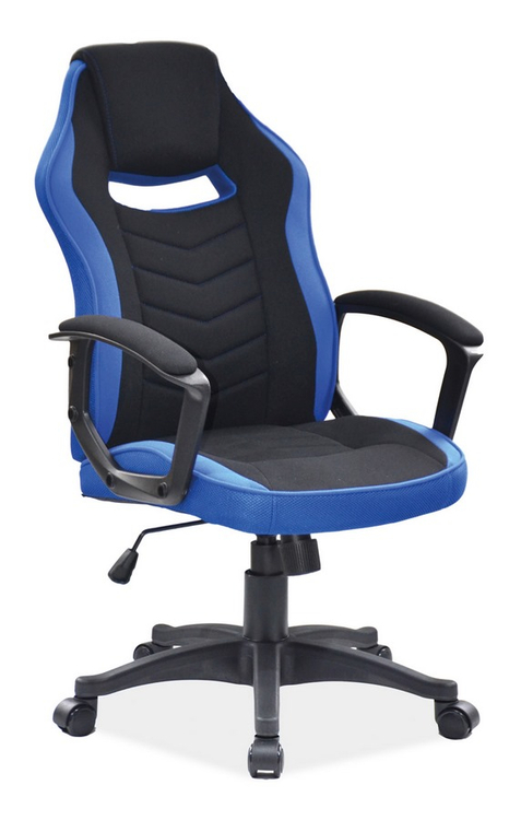 Moderní otáčecí kancelářské křeslo s možností nastavení výšky sedadla. Podstavec je z kovu, čalounění je z látky v černé a modré barvě. Kolečka jsou kaučukové. Výška sedadla je v rozmezí 44 – 54 cm, celková výška je 106 – 116 cm.CASA 11537
