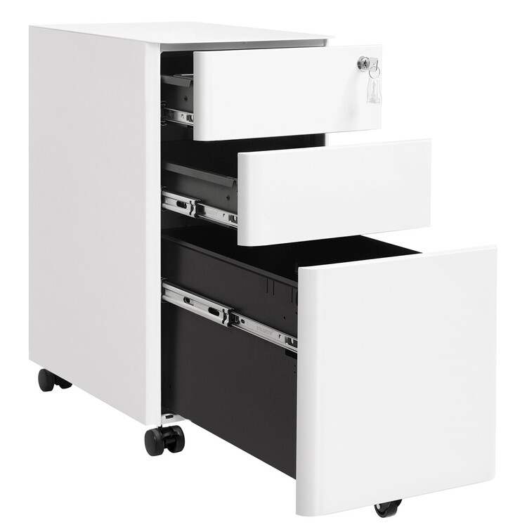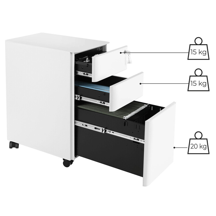 Pojízdné zásuvky v bílém provedení jsou vyrobeny z pevného kovu, který zajišťuje stabilitu a dlouhou životnost. Kompaktní komoda nabízí tři zásuvky s hladkým výsuvem, přičemž horní zásuvka je vybavena zámkem pro bezpečné uložení důležitých dokumentů či osobních věcí. Díky přídavným kolečkům je možné zásuvky snadno přesouvat podle potřeby, což přispívá k flexibilitě pracovního prostoru. Povrchová úprava v bílé barvě ladí s moderním kancelářským interiérem a usnadňuje údržbu. Rozměry a praktické uspořádání úložného prostoru umožňují efektivní organizaci kancelářských potřeb.