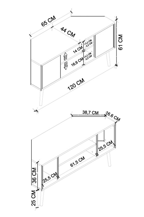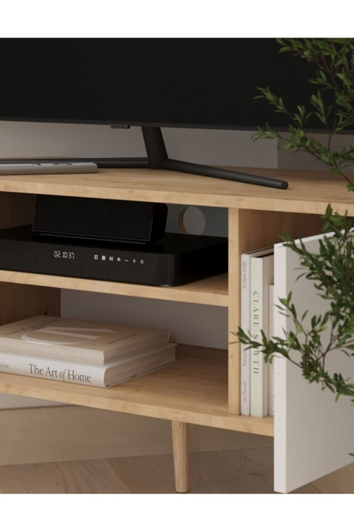TV stolek disponuje otevřenými policemi pro multimediální zařízení a uzavíratelnými skříňkami, kde můžete uložit kabely, ovladače či další doplňky. Praktická horní deska poskytuje stabilní místo pro televizor i dekorace.