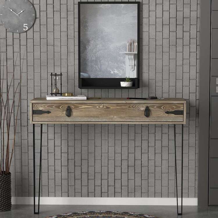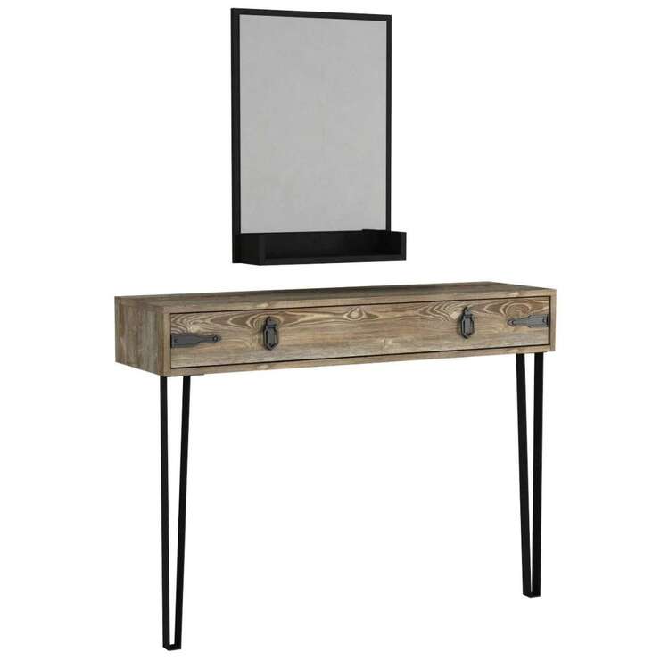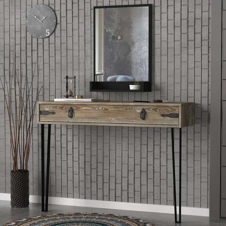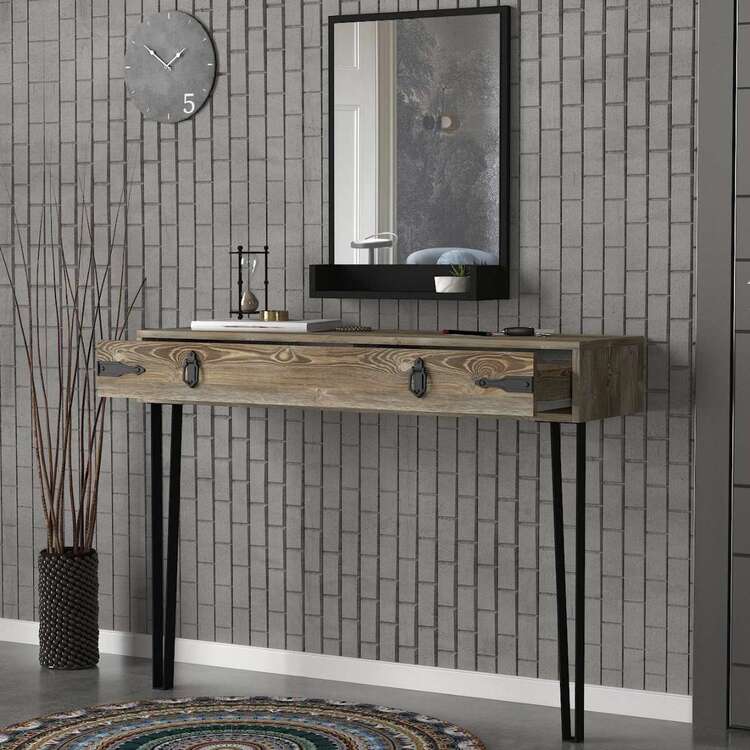 Konzolový stolek vyniká svou světle hnědou barvou, která přidává do každého interiéru nádech tepla a elegance. Praktická zásuvka nabízí dostatek úložného prostoru pro vaše drobnosti, zatímco nástěnné zrcadlo opticky zvětšuje a prosvětluje místnost.