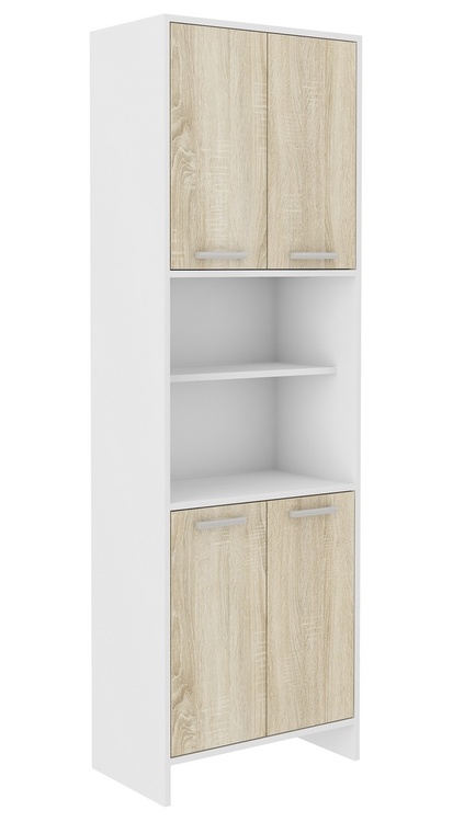 Kombinovaná skříň čtyřdvéřová, stylová a zároveň vhodná do moderních interiérů. V horní i dolná části je dvoudveřová skříňka, uprostře jsou police. Korpus i dvířka jsou vyrobeny z desky LTD 16 mm potažené PVC folií v barvě bílá/dvířka v dub sonoma. Zadní strana je ze sololitu. Úchyty jsou... více informací o zboží