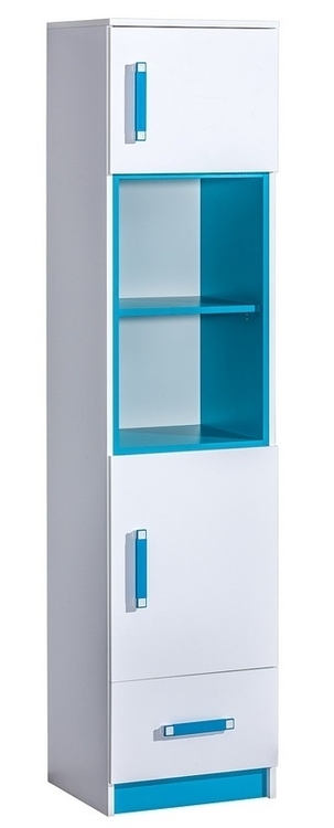 Kombinovaná úzká skříň TRAFICO ze sektorové řady, která se vyznačuje netradičním zpracováním barev a originalitou úchytů. Tento styl nábytku zaujme každou mladší generaci. Skříň je vyrobena z kvalitní LTD desky hraněné ABS lištou. Korpus i dveře jsou v bílé matné barvě, doplňková barva je tyrkys. Úchytky jsou v barevné kombinaci tyrkys/bílá. V dolní části skříně je zásuvka. Sektorový nábytek TRAFICO má široký výběr prvků, který Vám zaručí sestavit si dětský nebo studentský pokoj, ložnici či kancelář podle svých potřeb, přání a představ. Dodáváme v demontovaném stavu.CASA 23005