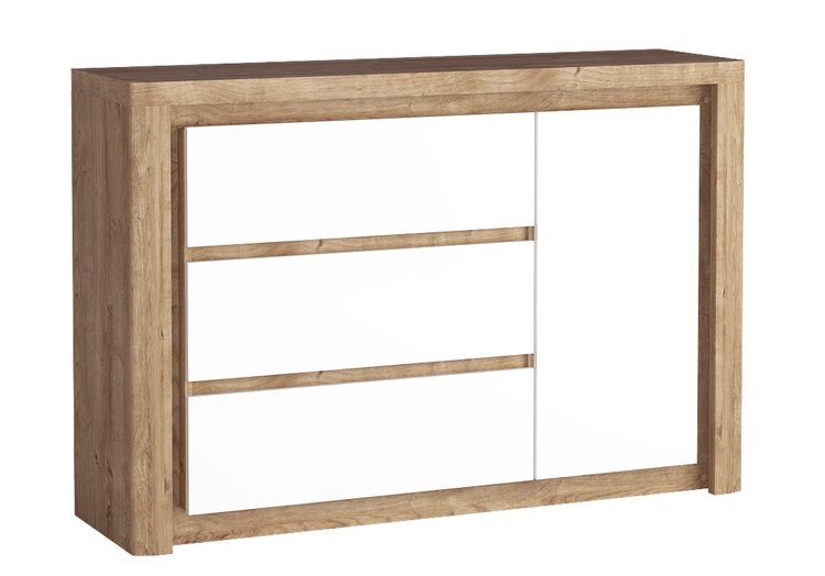 Komoda jednodveřová se třemi zásuvkami s LED osvětlením v moderním bezúchytovém provedení. Kolekce nábytku v sobě spojuje jednoduchost, originální vzhled a funkčnost. Nábytek je vyroben z kvalitního lamina ohraničeného ABS páskou, korpus je v barevném provedení dub ribbeck, dvířka a zásuvky jsou v barvě bílá lesk, doplněno lištou z MDF. Zásuvky i dvířka jsou vybaveny systémem tichého dovírání. Kolekce se skládá z mnoha prvků a tento široký výběr Vám zaručí sestavit si nábytek podle svých vlastních představ a přání. Dodáváme v demontovaném stavu.CASA 71024