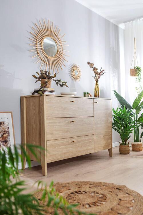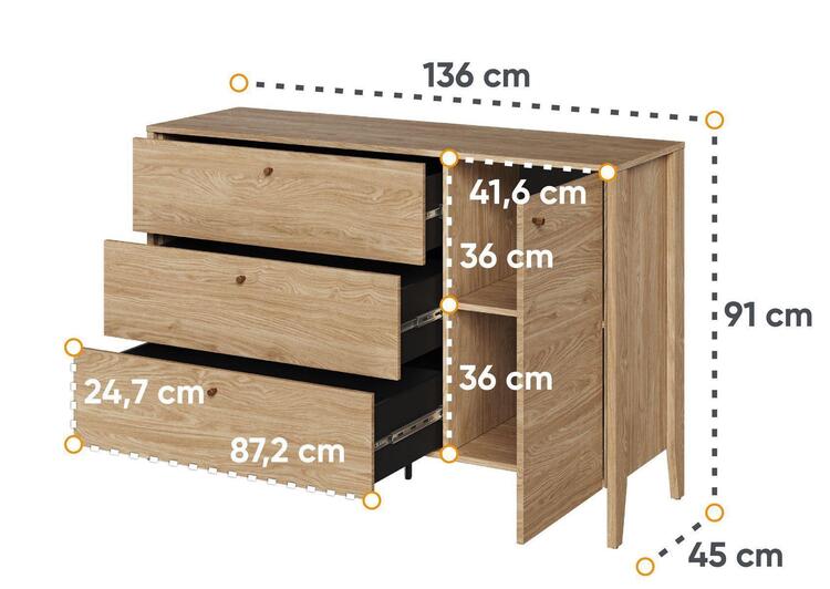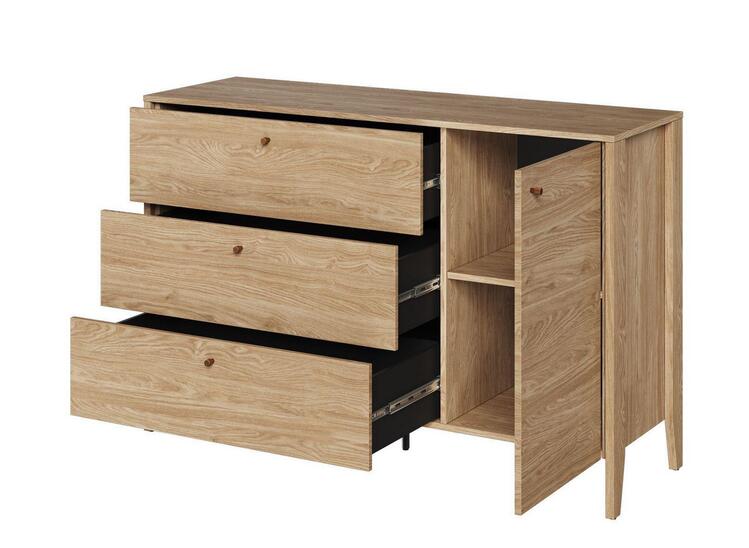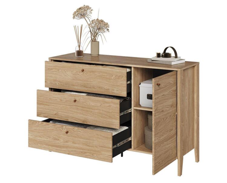 Komoda s jedny dvířky a třemi zásuvkami. Kolekce je příkladem pohodlí, funkčnosti a nadčasového designu. Každý kus nábytku v této kolekci je vyroben z kvalitních materiálů, které zaručují dlouhou životnost a zároveň vnášejí do vaší ložnice teplý a útulný vzhled. Díky jemným detailům, jako jsou prodyšná čela postelí, praktické úložné prostory a moderní kovové úchyty, je každý prvek navržen tak, aby byl nejen krásný, ale i maximálně funkční. Elegantní dekor v barvě olejovaného dubu dodávají nábytku přirozený vzhled, který se snadno kombinuje s různými styly. S tímto nábytkem si vytvoříte ložnici, která bude dokonale ladit s vaším životním stylem. Dodáváme v demontovaném stavu.