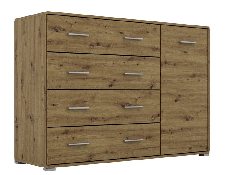 Komoda jednodveřová se čtyřmi zásuvkami je vyrobená z kvalitní laminátové desky (odolné a ekologicky šetrné) v barevném provedení dub artisan. Kvalitní pojezdy zajišťují hladký a tichý pohyb zásuvek. Dodáváme v demontovaném stavu.CASA 83179
