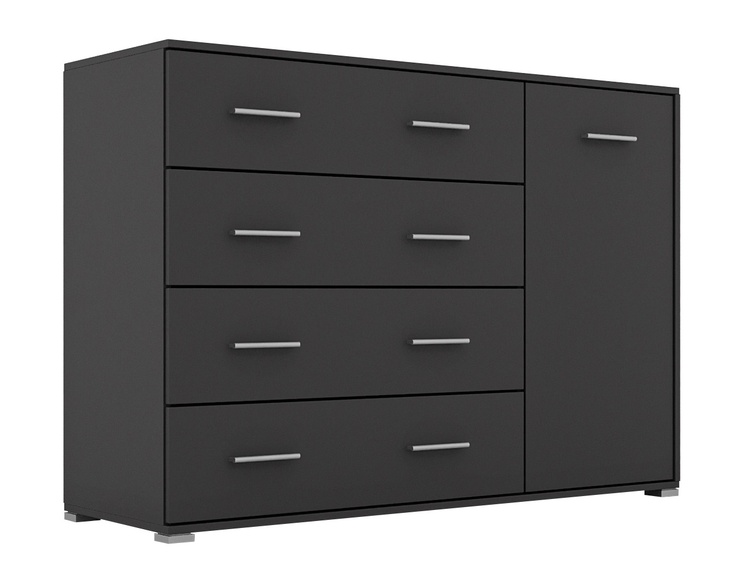 Komoda jednodveřová se čtyřmi zásuvkami je vyrobená z kvalitní laminátové desky (odolné a ekologicky šetrné) v barevném provedení šedý grafit. Kvalitní pojezdy zajišťují hladký a tichý pohyb zásuvek. Dodáváme v demontovaném stavu.CASA 83179