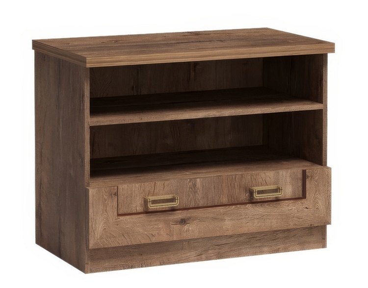 Komoda 1s ze sektorové řady. Komoda má 1 praktickou zásuvku. Systém je exkluzivní kolekce navržena v duchu vintage. Celá řada se vyznačuje elegancí a jednoduchými tvary, které zaručují plné využití prostoru. Nábytek je vyroben z velmi kvalitní LTD o tloušťce 16 mm, horní deska zesílena na 32 mm, lišty na čele nábytku jsou MDF, hrany ABS. Tvrzené sklo ve vitrínách je jemně zdobené. Elegantní úchyty jsou z kovu. Barevné provedení dub lefkas. Dodáváme v demontovaném stavu.CASA 71013