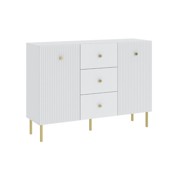 Komoda dvoudveřová se třemi zásuvkami v elegantním stylu, je vyrobena z kvalitní LTD desky v barevném provedení bílá. Přední část nábytku je doplněna dekorem frézovaných dveří. Vysoké kovové nožky nábytku a úchyty jsou v barevném provedení zlatá. V naší nabídce naleznete více variant nábytku... více informací o zboží