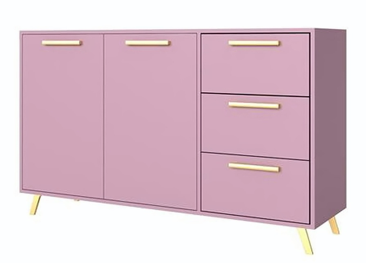 Komoda dvoudveřová v moderním provedení. Komoda je vyrobena z kvalitního LTD v barvě pastelově fialové. V pravé části jsou tři zásuvky. Nožky i úchyty jsou z plastu zlaté barvy. Dodáváme v demontovaném stavu.CASA 31004