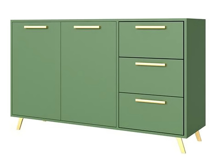 Komoda dvoudveřová v moderním provedení. Komoda je vyrobena z kvalitního LTD v barvě pastelově zelené. V pravé části jsou tři zásuvky. Nožky i úchyty jsou z plastu zlaté barvy. Dodáváme v demontovaném stavu.CASA 31004