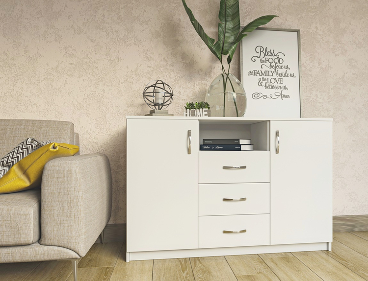 Komoda dvoudveřová se třemi zásuvkami je vyrobená z kvalitní laminátové desky v barevném provedení bílá (NImfea alba). Úchyty jsou kovové. Dodáváme v demontovaném stavu.CASA 83097