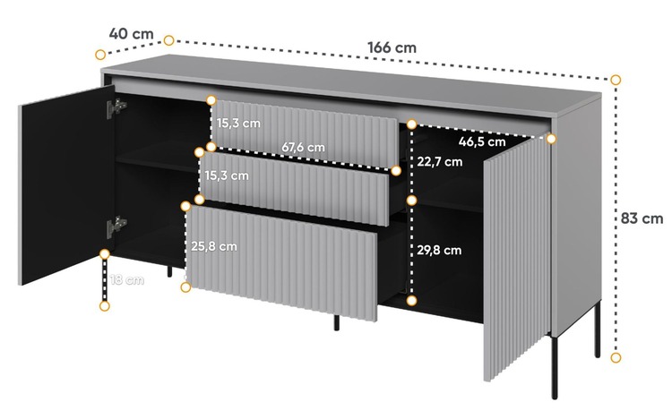 Obsahuje – 2 dvířka + 3 prostorné zásuvky.