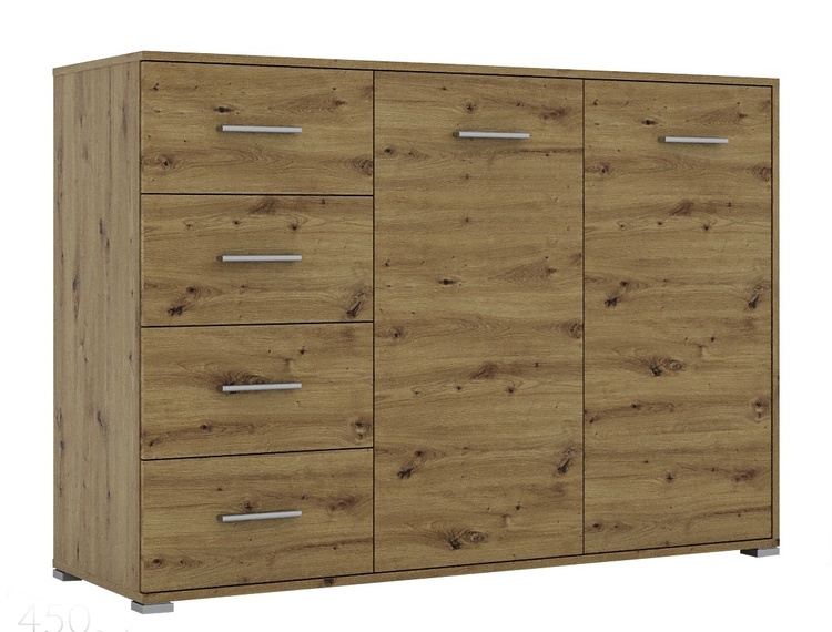 Komoda dvoudveřová se čtyřmi zásuvkami je vyrobená z kvalitní laminátové desky (odolné a ekologicky šetrné) v barevném provedení dub artisan. Kvalitní pojezdy zajišťují hladký a tichý pohyb zásuvek. Dodáváme v demontovaném stavu.