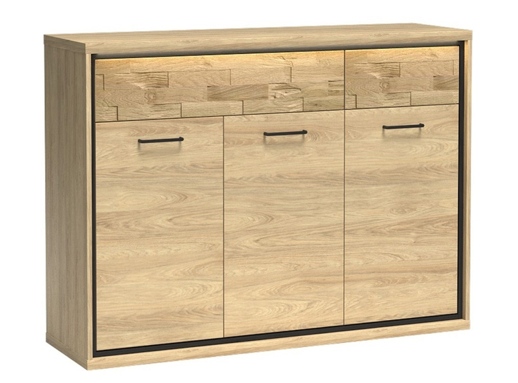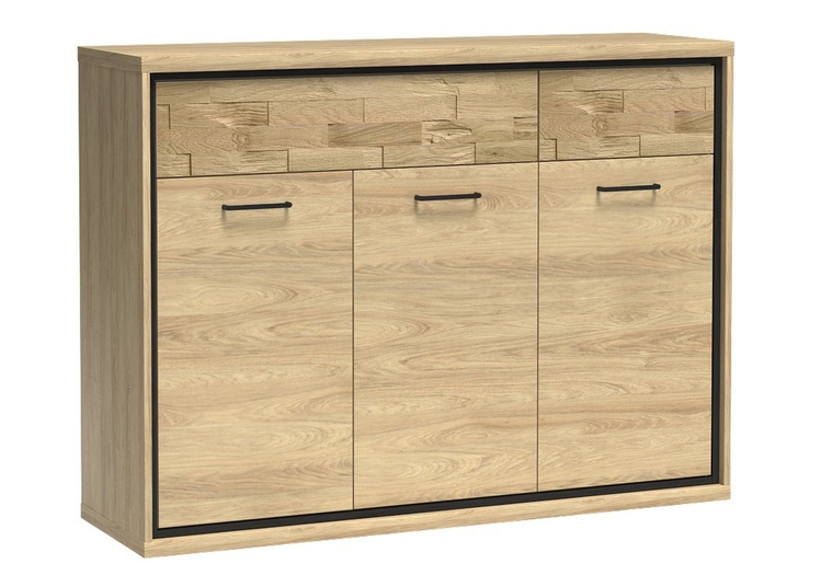 Komoda třídveřová se zásuvkami v industriálním stylu v barevném provedení dub hickory, doplněno prvky v černé barvě. Nábytek je vyroben z kvalitního lamina ohraničeného ABS páskou a také je vybaven systémem tichého dovírání. Zásuvky jsou doplněny dekorační dubovou deskou a systémem push to open – otvírání zmáčknutím zásuvky. Úchyty jsou černé kovové. Dále je možné dokoupit LED dekorační pásek. Kolekce se skládá z mnoha prvků a tento široký výběr Vám zaručí sestavit si nábytek podle svých vlastních představ a přání. Dodáváme v demontovaném stavu.CASA 71027
