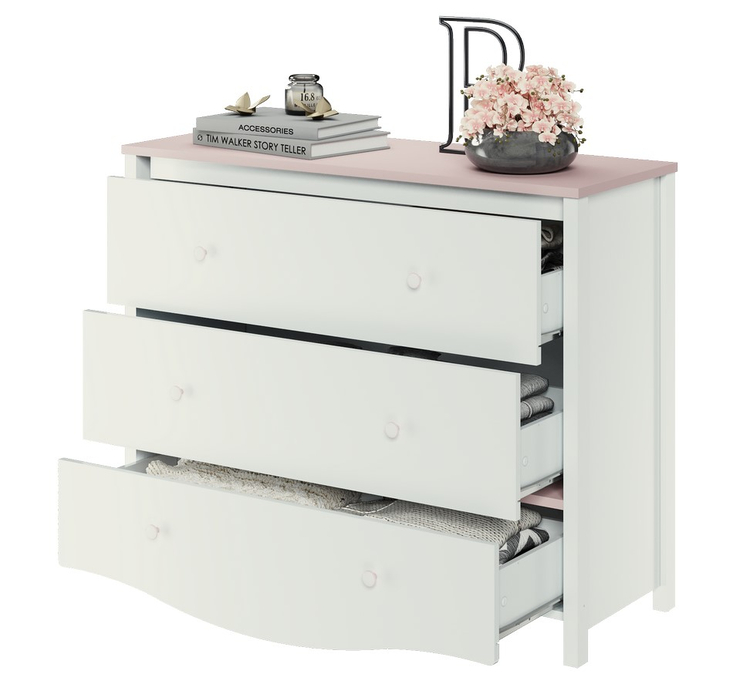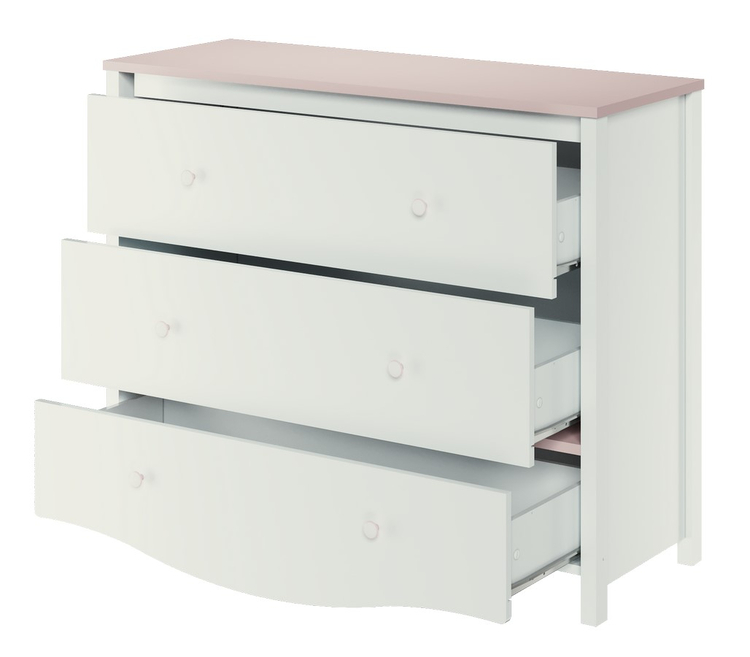 Komoda MI-16. Komoda má 3 zásuvky. Nábytek je vyrobený z kvalitního lamina ohraničené ABS páskou, dolní část velké zásuvky je vyřezaná do obloučku. Komoda je v barvě bílé a růžové. V naší nabídce najdete mnoho dalších prvků této sestavy a tento široký výběr Vám zaručí sestavit si útulný dětský... více informací o zboží