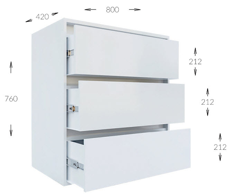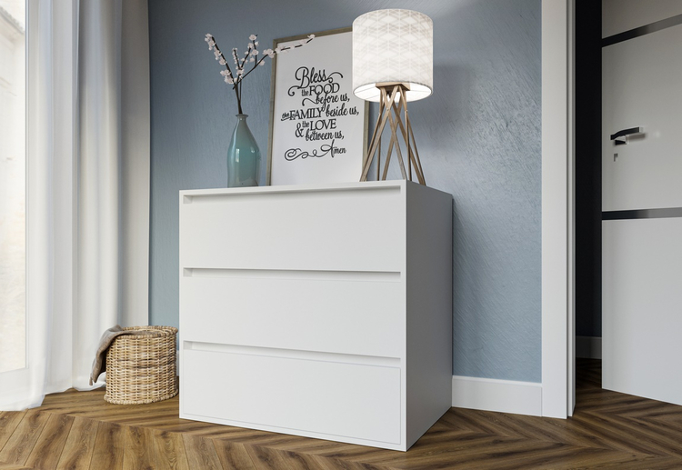 Komoda se třemi zásuvkami je vyrobená z kvalitní laminátové desky v barevném provedení bílá (NImfea alba). Zásuvky jsou bezúchytové. Dodáváme v demontovaném stavu.CASA 83096