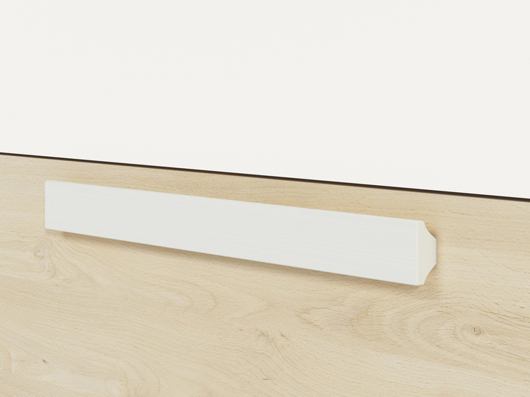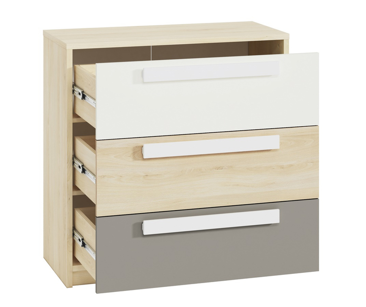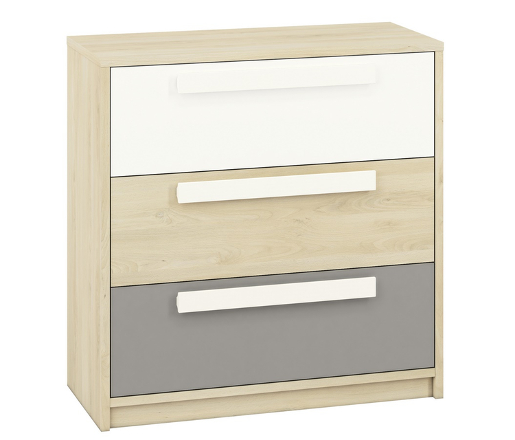 Komoda se třemi zásuvkami v moderním provedení. Korpus je vyroben z kvalitní desky LTD hraněné ABS páskou v barvě buk fjord, zásuvky jsou vyrobeny z desky LTD v kombinaci barev buk fjord/bílá/šedá. Úchyty jsou dřevěné bílé. Dodáváme v demontovaném stavu.CASA 56010