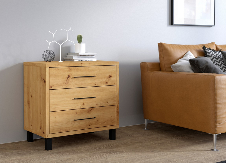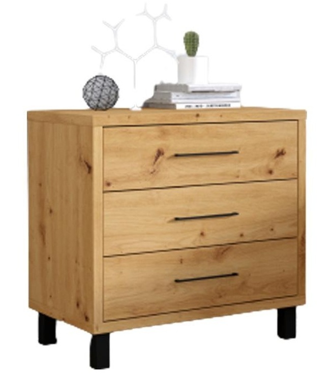 Komoda se třemi zásuvkami. Komoda je vyrobena z kvalitního lamina v barvě dub artisan. Úchyty jsou kovové černé. Nožky jsou černé. Dodáváme v demontovaném stavu.CASA 87017