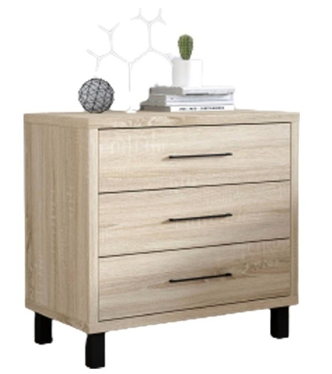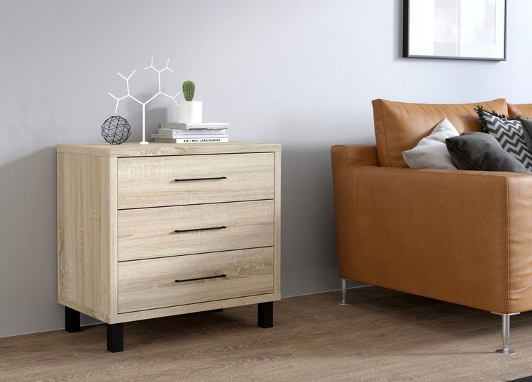Komoda se třemi zásuvkami. Komoda je vyrobena z kvalitního lamina v barvě dub sonoma. Úchyty jsou kovové černé. Nožky jsou černé. Dodáváme v demontovaném stavu.CASA 87017