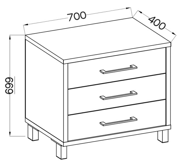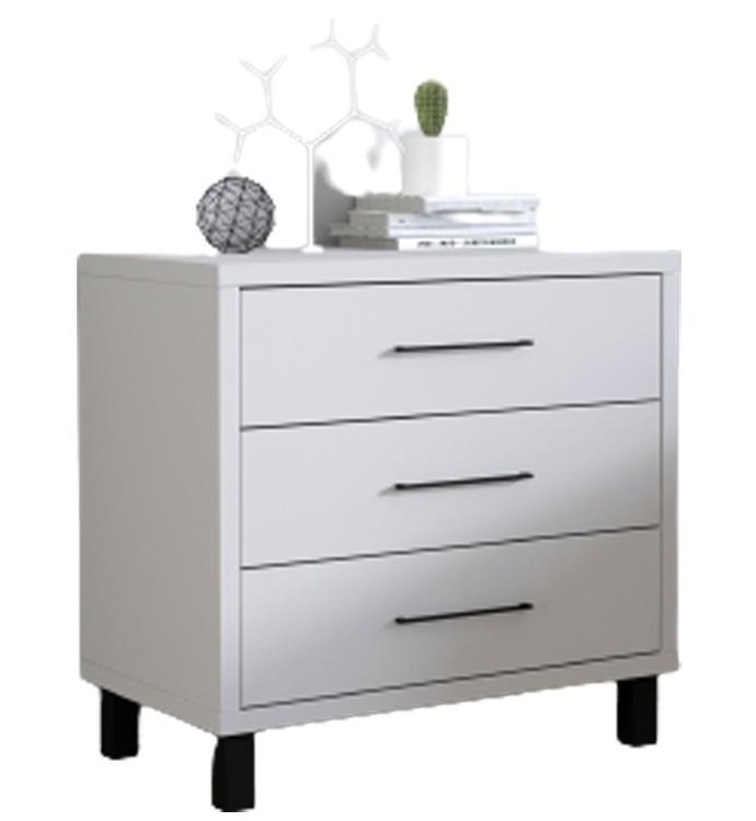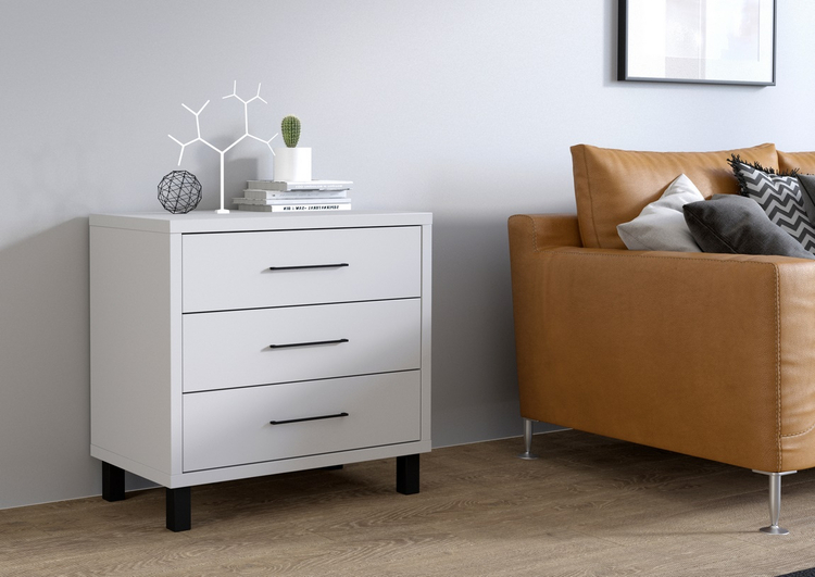 Komoda se třemi zásuvkami. Komoda je vyrobena z kvalitního lamina v barvě světle šedá. Úchyty jsou kovové černé. Nožky jsou černé. Dodáváme v demontovaném stavu.CASA 87017