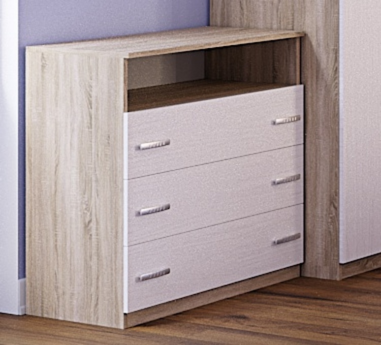 Komoda se třemi zásuvkami a regálem je vyrobena z LTD desky odolné vůči poškrábání, korpus je v barvě dub sonoma a čela zásuvek jsou v barvě bílá strukturální. Dodáváme v demontovaném stavu.CASA 19010
