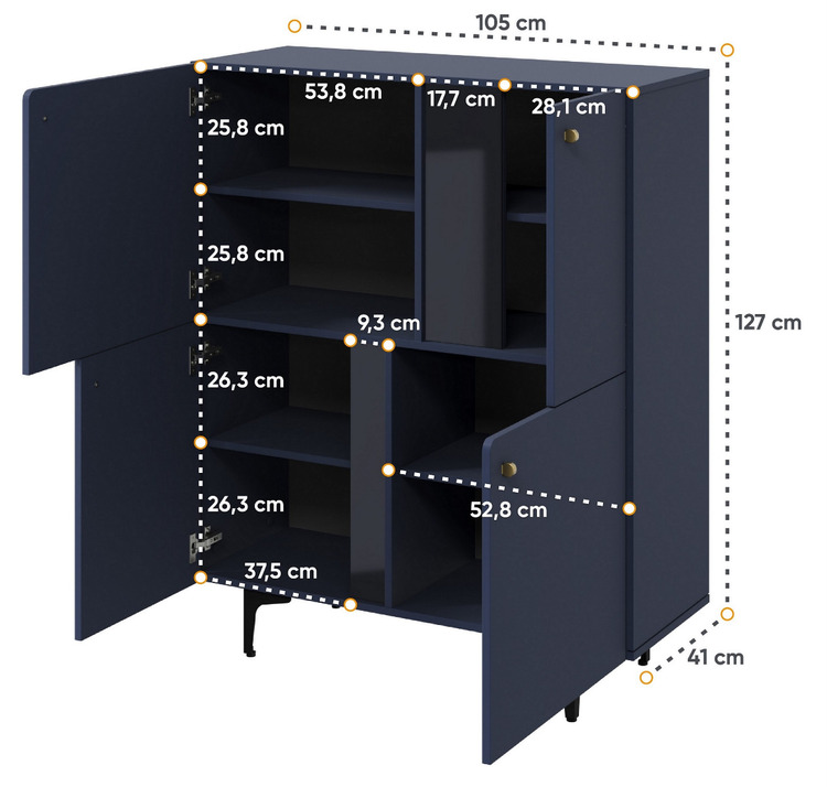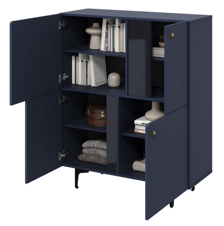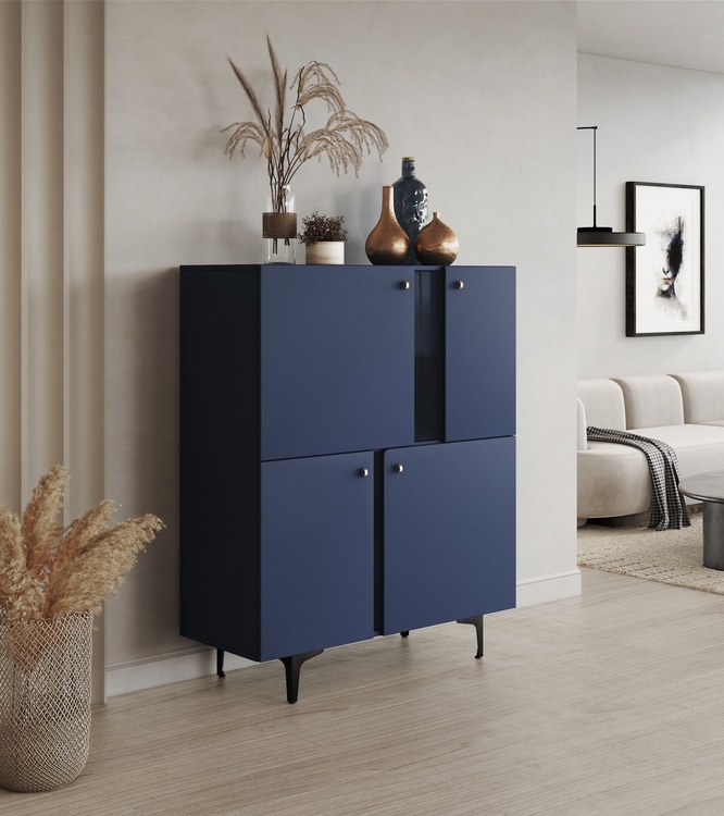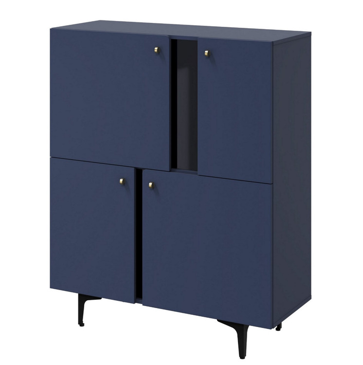 Komoda čtyřdvéřová. Dvířka mají soft close – systém tichého dovírání. Kolekce moderních komod je určena pro ty, kteří milují barevné prostory, ale také pro ty, kteří dávají přednost vnesení barvy do interiéru pomocí jednoho výrazného prvku. Není žádným tajemstvím, že barva v interiéru hraje obrovskou, téměř klíčovou roli. Její výběr ovlivňuje nejen celkový vzhled místnosti, ale především naši náladu. Rozměry viz obrázek. Barevné provedení – tmavě modrá granát, úchyty jsou tvarované zlaté. Dodáváme v demontovaném stavu.