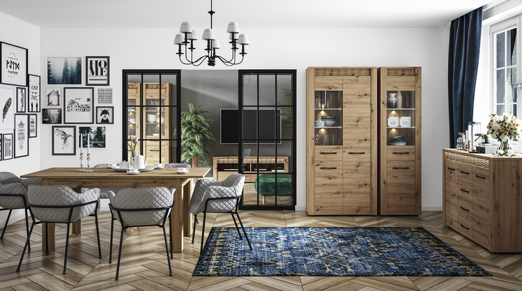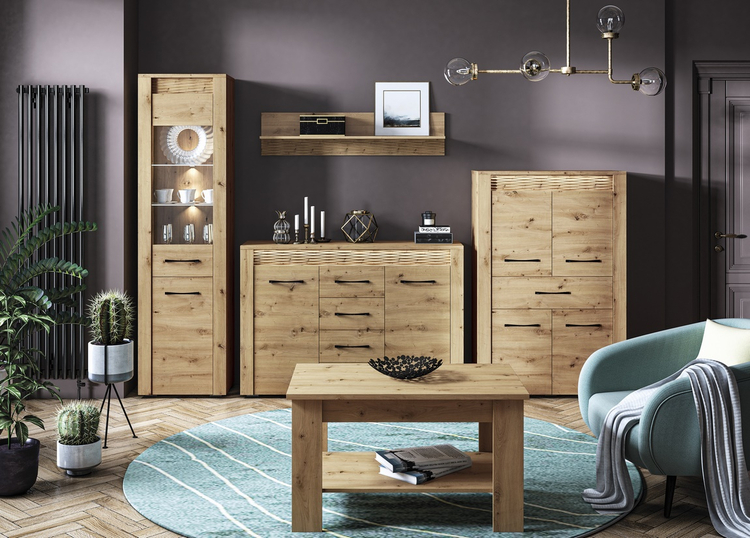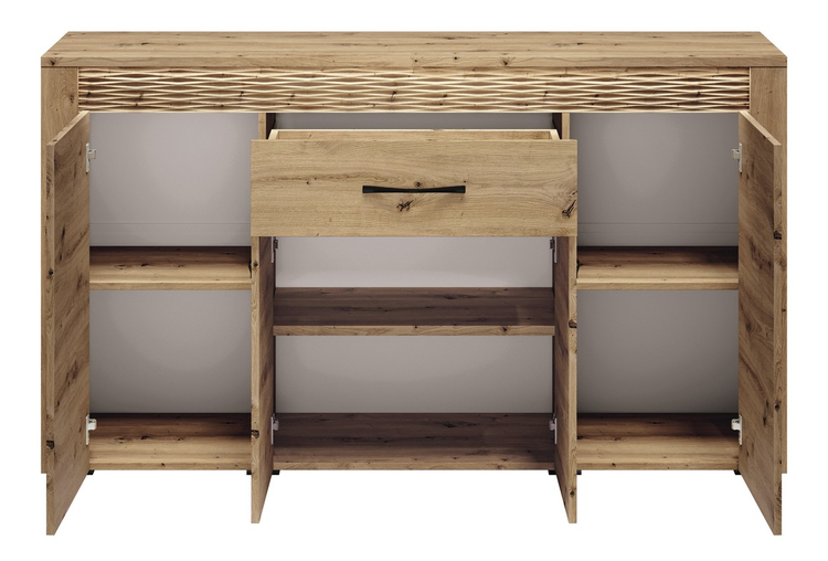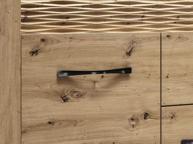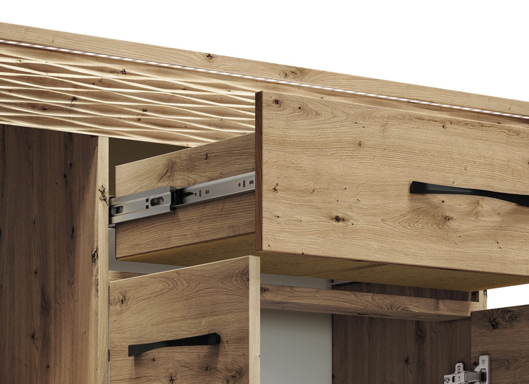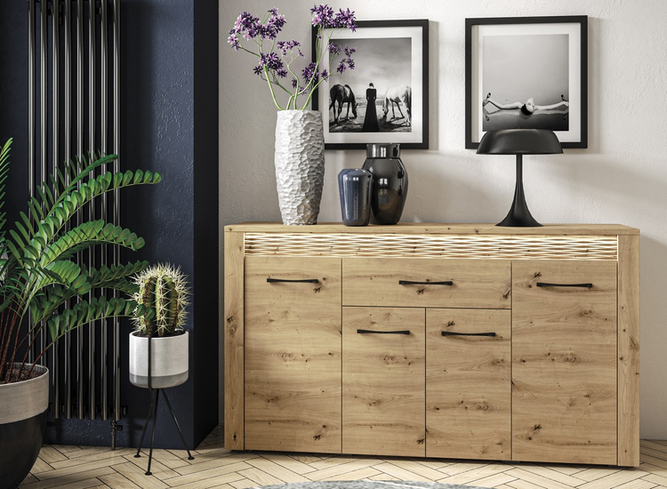 Komoda čtyřdveřová se zásuvkou je vyrobena z kvalitní desky LTD hraněné ABS páskou v barvě dub artisan. Dekorační riflovaná lišta nahoře z MDF obsahuje LED osvětlení v ceně. Dvířka jsou vybaveny systémem tichého dovírání. Úchyty jsou kovové černé. Dodáváme v demontovaném stavu.CASA 56004