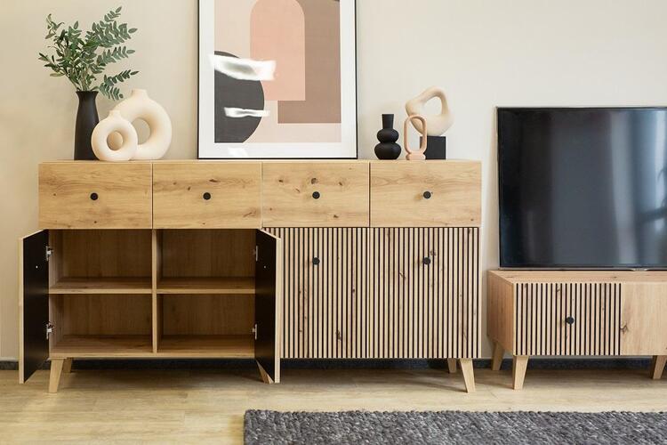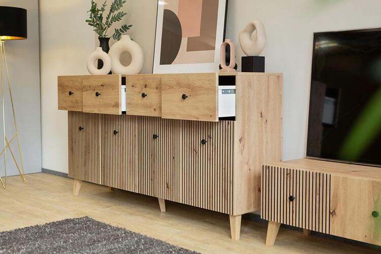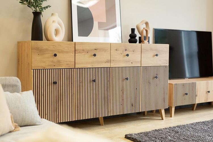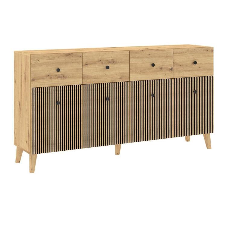 Komoda čtyřdveřová se čtyřmi zásuvkami je vyrobena z kvalitní LTD v barevném provedení dub artisan/černá. Netradiční frézování předních dvířek v kombinaci s minimalistickými úchyty a vysokými nožkami, dodává této kolekci moderní vzhled. Nabídka komponentů této sektorové řady umožňuje sestavit... více informací o zboží