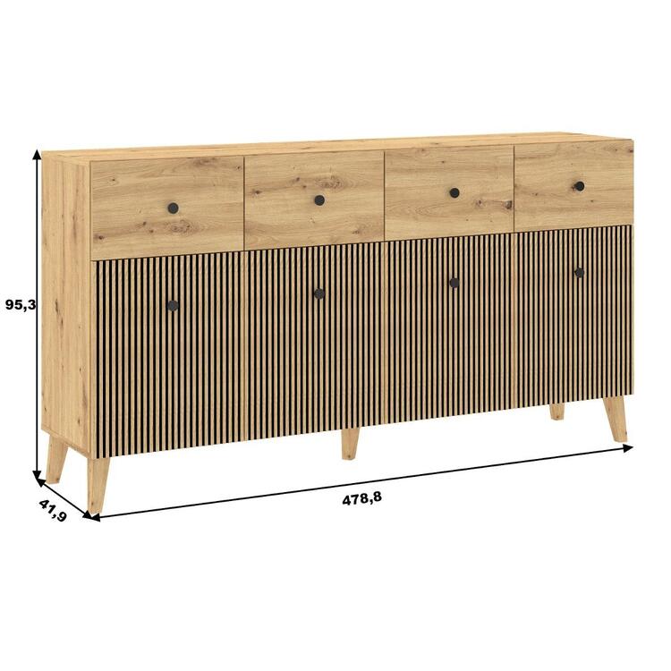 Komoda čtyřdveřová se čtyřmi zásuvkami je vyrobena z kvalitní LTD v barevném provedení dub artisan/černá. Netradiční frézování předních dvířek v kombinaci s minimalistickými úchyty a vysokými nožkami, dodává této kolekci moderní vzhled. Nabídka komponentů této sektorové řady umožňuje sestavit si nábytek dle vlastních představ. Dodáváme v demontovaném stavu.CASA 85025