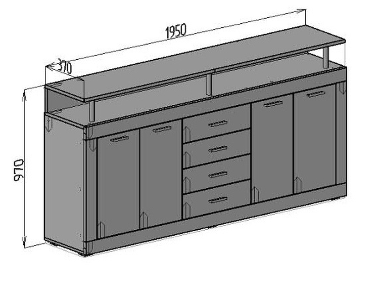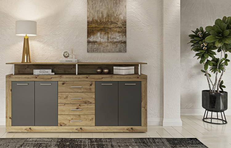 Komoda čtyřdveřová se čtyřmi zásuvkami je vyrobená z kvalitní laminátové desky v barevném provedení korpusu a čela zásuvek dub artisan, čela dvířek jsou v barvě šedá. Dodáváme v demontovaném stavu.CASA 83101
