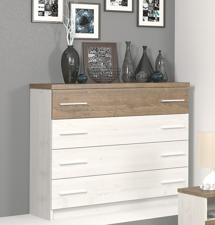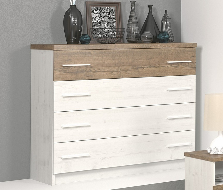 Komoda se 4 zásuvkami z ložnicové řady. Moderní provedení v barvě borovice andersen v kombinaci s dubem april dokonale doplní váš interiér. Komoda je vyrobena z kvalitní LTD desky. Nabídka komponentů této sektorové řady umožňuje sestavit si nábytek do ložnice nebo studentského pokoje dle... více informací o zboží