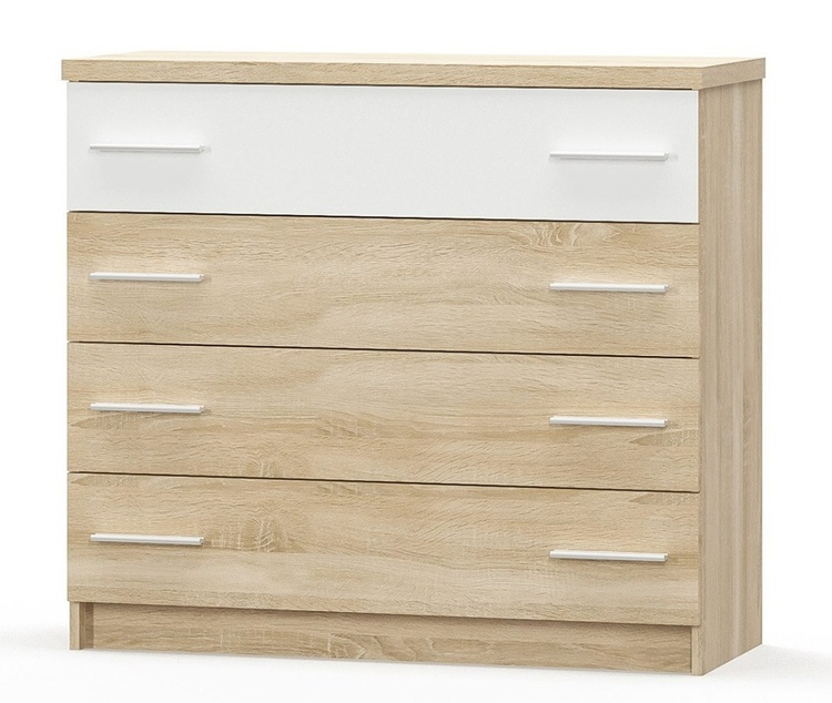 Komoda se 4 zásuvkami z ložnicové řady. Moderní provedení v barvě dub sonoma v kombinaci s bílou dokonale doplní váš interiér. Komoda je vyrobena z kvalitní LTD desky. Nabídka komponentů této sektorové řady umožňuje sestavit si nábytek do ložnice nebo studentského pokoje dle vlastních představ. Dodáváme v demontovaném stavu.CASA 97004