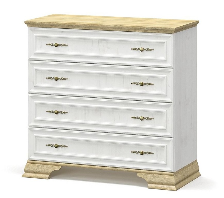 Komoda se 4 zásuvkami ze sektorové řady nábytku v romantickém stylu. Nábytek je vyroben z kvalitní LTD v kombinaci s MDF v barevné kombinaci borovice andersen/zlatý dub. V naší nabídce najdete další jednotlivé prvky tohoto nábytku, ze kterého si můžete zařídit obývací pokoj dle vlastních potřeb. Dodáváme v demontovaném stavu.CASA 97011