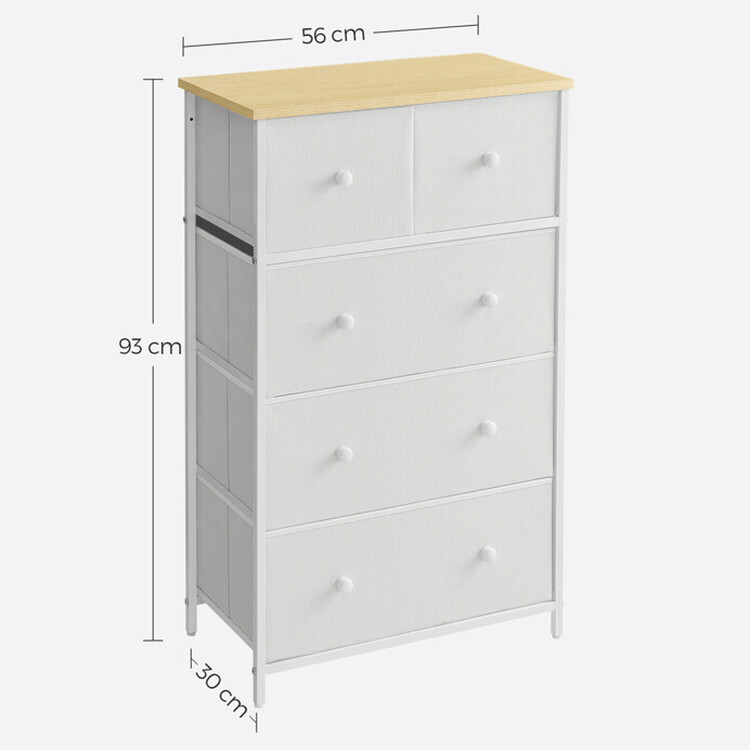 Komoda o rozměrech 56×30×93 cm kombinuje pevnou MDF desku s matným dubovým dekorem a stabilní kovovou konstrukci v bílém provedení. Čtyři prostorné látkové zásuvky z netkané textilie poskytují praktický úložný prostor, který je lehký a snadno přístupný díky kulatým úchytkám. Kovové nohy zajišťují pevnou oporu a stabilitu celé komody, zatímco matný povrch desky usnadňuje údržbu a odolává běžnému opotřebení. Komoda je vhodná do moderních i klasických interiérů, kde oceníte kombinaci funkčnosti a jednoduchého designu.