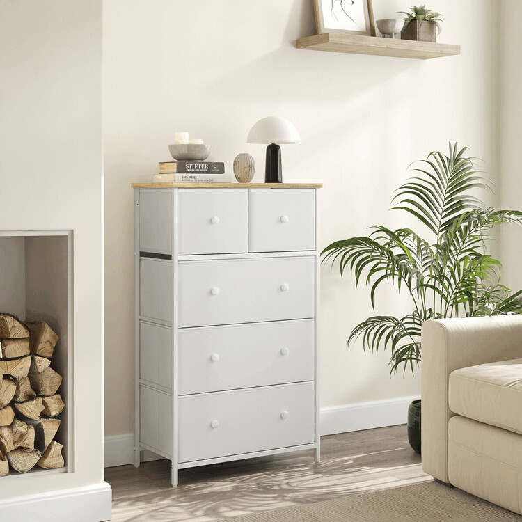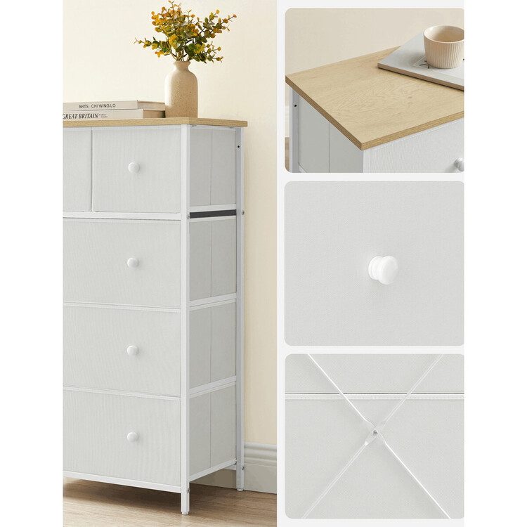 Komoda o rozměrech 56×30×93 cm kombinuje pevnou MDF desku s matným dubovým dekorem a stabilní kovovou konstrukci v bílém provedení. Čtyři prostorné látkové zásuvky z netkané textilie poskytují praktický úložný prostor, který je lehký a snadno přístupný díky kulatým úchytkám. Kovové nohy... více informací o zboží