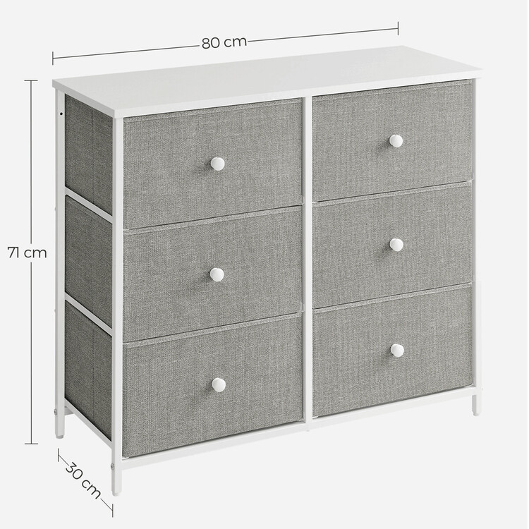 Komoda o rozměrech 80×30×71 cm kombinuje pevnou MDF desku s matnou bílou povrchovou úpravou a stabilní kovovou konstrukcí v šedé barvě. Šest prostorných zásuvek z netkané textilie nabízí praktické úložné řešení s jednoduchým přístupem díky kulatým úchytkům. Kovové nohy zajišťují stabilitu a odolnost, zatímco lehká látková provedení zásuvek usnadňují manipulaci a přispívají k vzdušnému vzhledu komody. Díky kompaktním rozměrům je vhodná do menších prostor, kde poskytuje dostatek místa pro organizaci drobných předmětů i textilu.