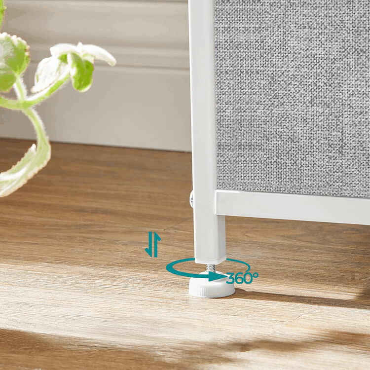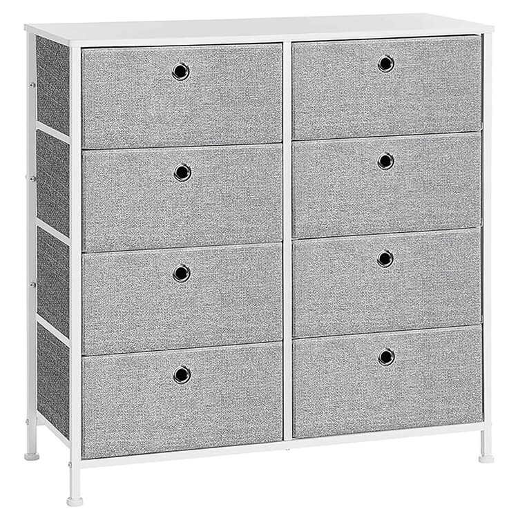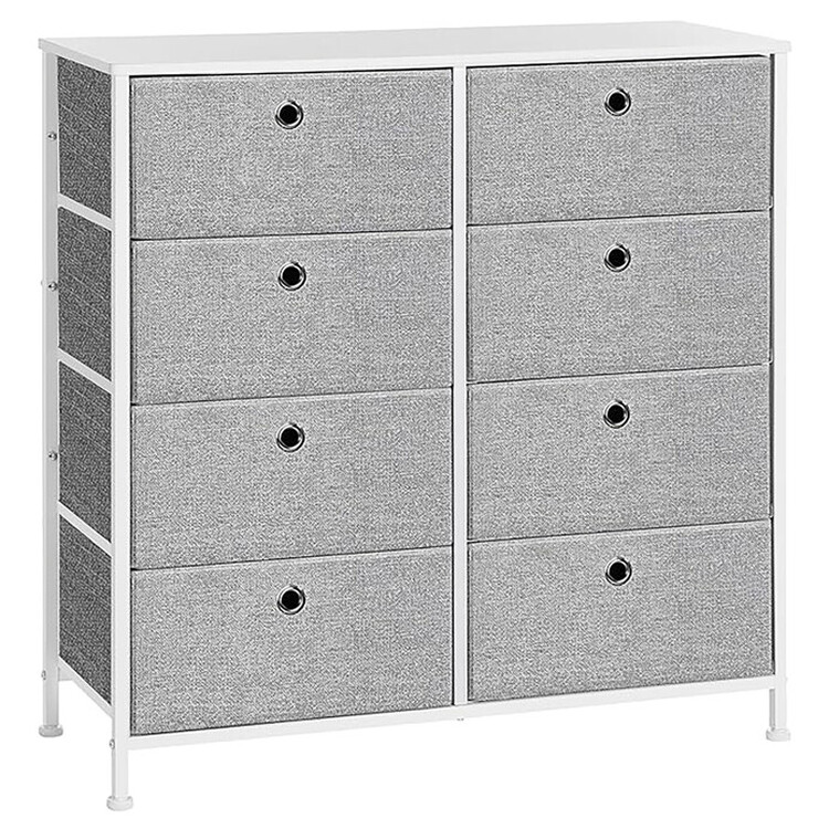 Komoda o rozměrech 80×30×82 cm kombinuje pevnou kovovou konstrukci s deskou z MDF v matném bílém provedení, která zajišťuje stabilitu a snadnou údržbu. Osm látkových zásuvek v šedé barvě nabízí praktický úložný prostor pro různé drobnosti a textilní materiál zásuvek přispívá k lehkému a vzdušnému vzhledu. Kovové nohy jsou vybaveny plastovými krytkami, které chrání podlahu před poškozením. Komoda je vhodná do moderních i minimalistických interiérů, kde oceníte kombinaci funkčnosti a jednoduchého designu.