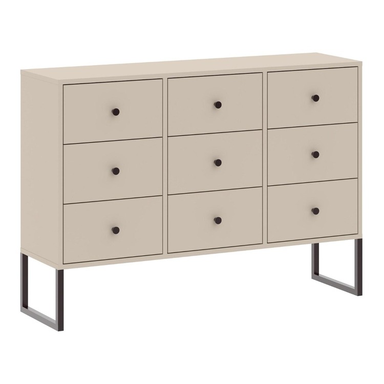 Komoda s devíti zásuvkami v loftovém stylu, je vyrobena z kvalitní LTD desky v barevném provedení kašmír. Konstrukce nožek je kovová v černé barvě. V naší nabídce naleznete více variant nábytku této řady. Dodáváme v demontovaném stavu.CASA 85034