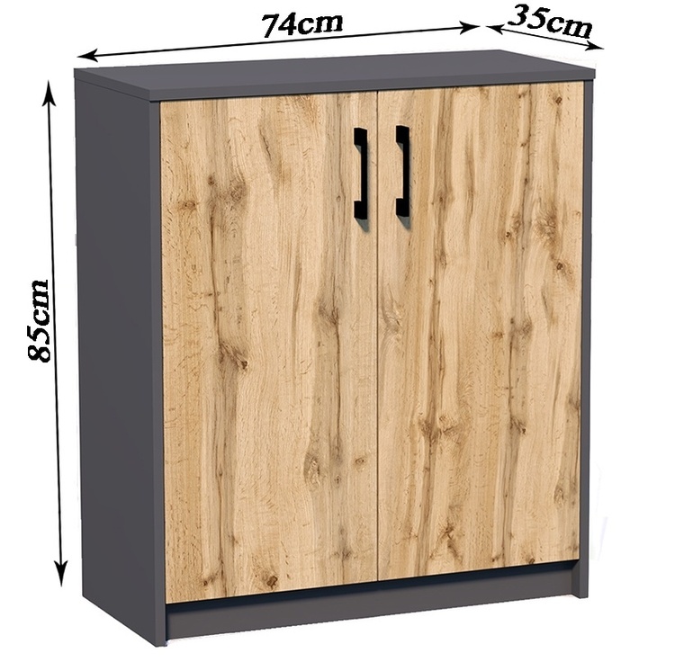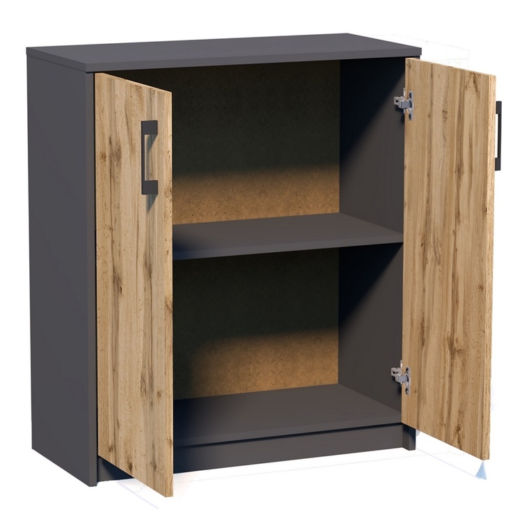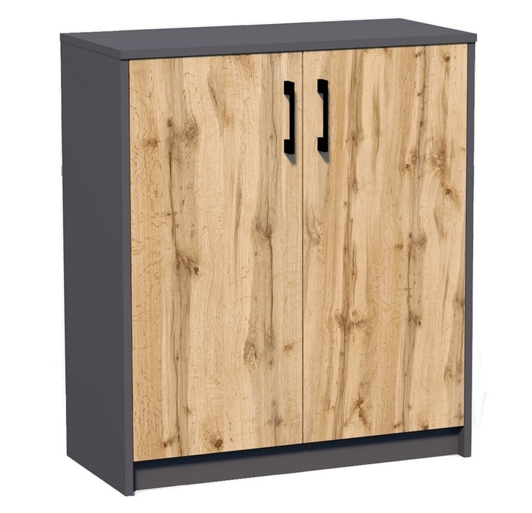 Komoda dvoudveřová v moderním provedení. Korpus v barvě grafit a dvířka v barvě dub wotan. Lamino je odolné vůči vysokým teplotám, poškrábání a nárazům, hraněné ABS páskou. Jasně viditelná struktura dřeva. Dodáváme v demontovaném stavu.CASA 53001