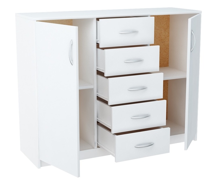 Dvoudveřová komoda s 5 zásuvkami v moderním provedení. Korpus i dvířka jsou z kvalitní LTD v barvě bílá. Lamino je odolné vůči vysokým teplotám, poškrábání a nárazům, hraněné ABS páskou. Jasně viditelná struktura dřeva. Pojezdy v zásuvkách jsou kovové s plastovými kolečky. Dodáváme v demontovaném stavu.CASA 53001