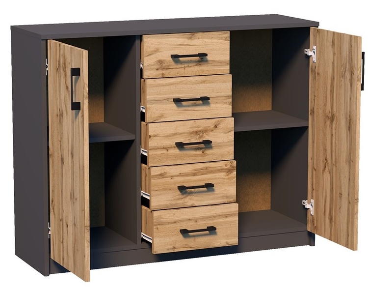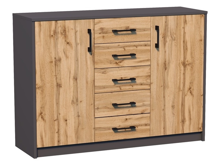 Dvoudveřová komoda s 5 zásuvkami v moderním provedení. Korpus i dvířka jsou z kvalitní LTD, korpus v barvě grafit a dvířka v barvě dub wotan. Lamino je odolné vůči vysokým teplotám, poškrábání a nárazům, hraněné ABS páskou. Jasně viditelná struktura dřeva. Pojezdy v zásuvkách jsou kovové s... více informací o zboží