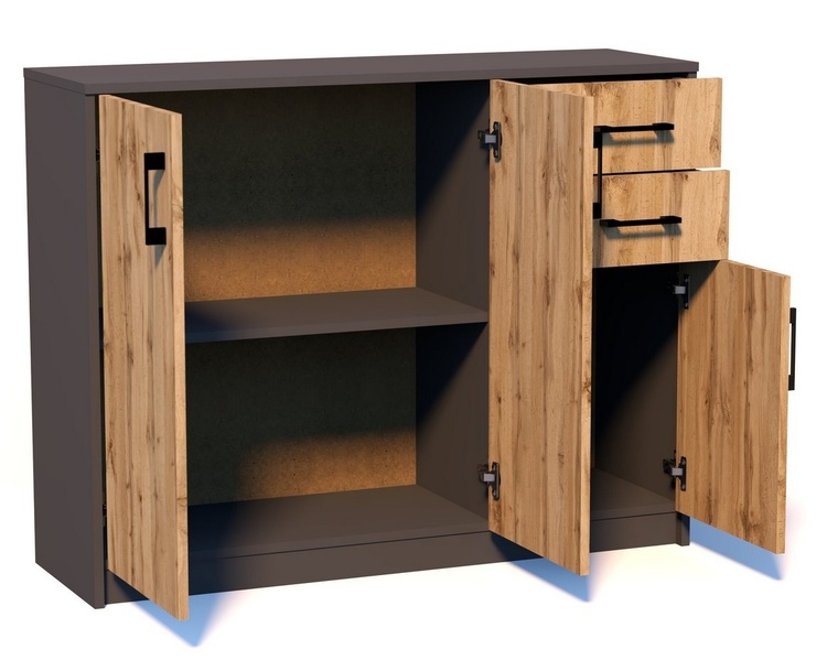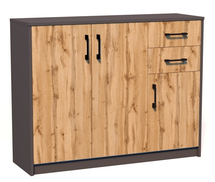 Třídveřová komoda se 2 zásuvkami v moderním provedení. Korpus i dvířka jsou z kvalitní LTD, korpus v barvě grafit a dvířka v barvě dub wotan. Lamino je odolné vůči vysokým teplotám, poškrábání a nárazům, hraněné ABS páskou. Jasně viditelná struktura dřeva. Pojezdy v zásuvkách jsou kovové s... více informací o zboží