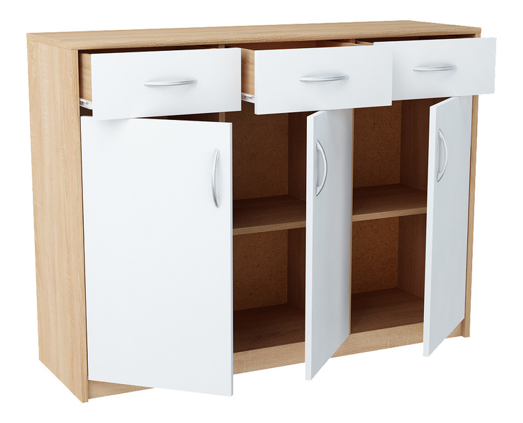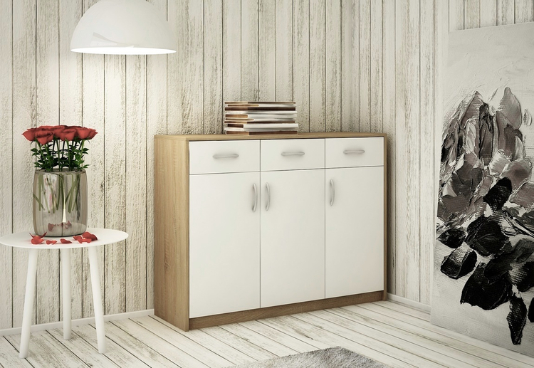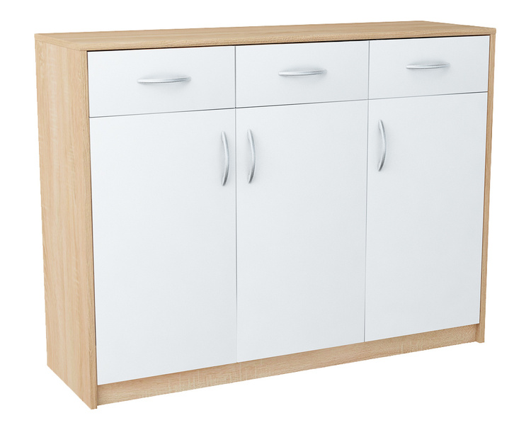 Třídveřová komoda se 3 zásuvkami v moderním provedení. Korpus i dvířka jsou z kvalitní LTD, korpus v barvě dub sonoma a dvířka v barvě bílá. Lamino je odolné vůči vysokým teplotám, poškrábání a nárazům, hraněné ABS páskou. Jasně viditelná struktura dřeva. Pojezdy v zásuvkách jsou kovové s... více informací o zboží