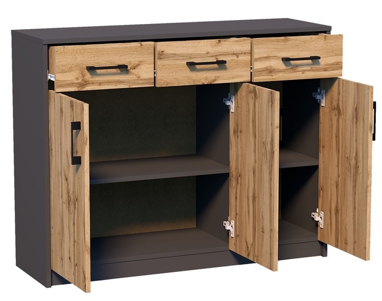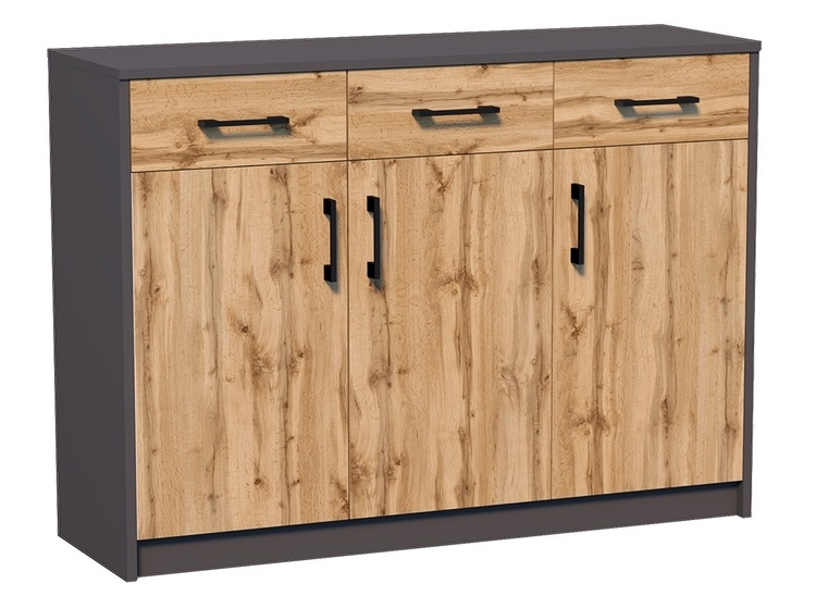 Třídveřová komoda se 3 zásuvkami v moderním provedení. Korpus i dvířka jsou z kvalitní LTD, korpus v barvě grafit a dvířka v barvě dub wotan. Lamino je odolné vůči vysokým teplotám, poškrábání a nárazům, hraněné ABS páskou. Jasně viditelná struktura dřeva. Pojezdy v zásuvkách jsou kovové s... více informací o zboží