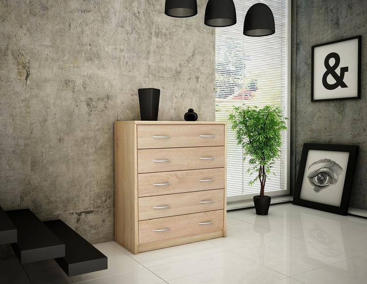 Komoda s 5 zásuvkami v moderním provedení. Korpus i dvířka jsou z kvalitní LTD v barvě dub sonoma. Lamino je odolné vůči vysokým teplotám, poškrábání a nárazům, hraněné ABS páskou. Jasně viditelná struktura dřeva. Pojezdy v zásuvkách jsou kovové s plastovými kolečky. Dodáváme v demontovaném... více informací o zboží