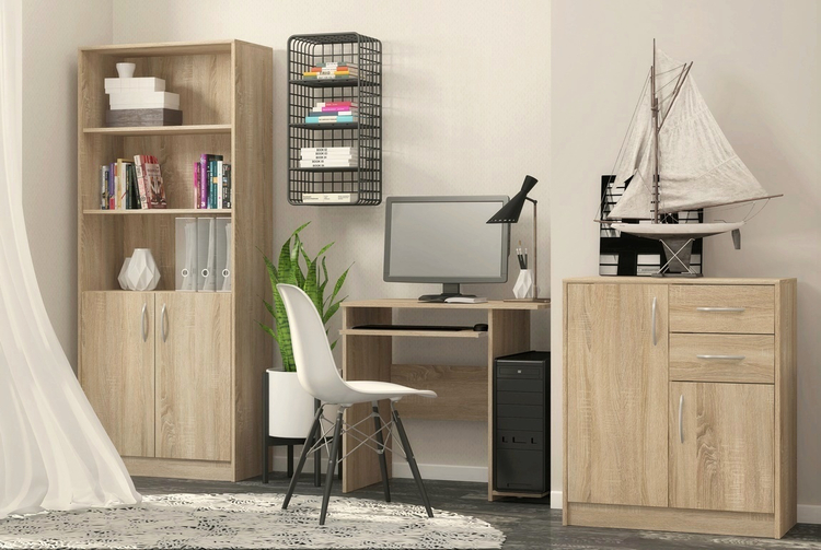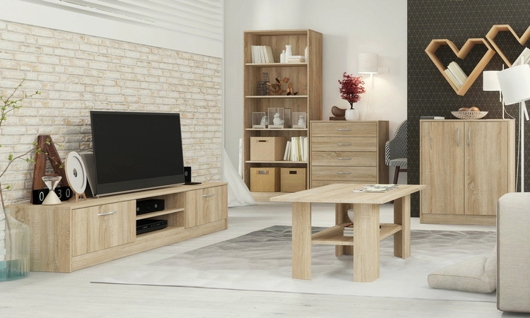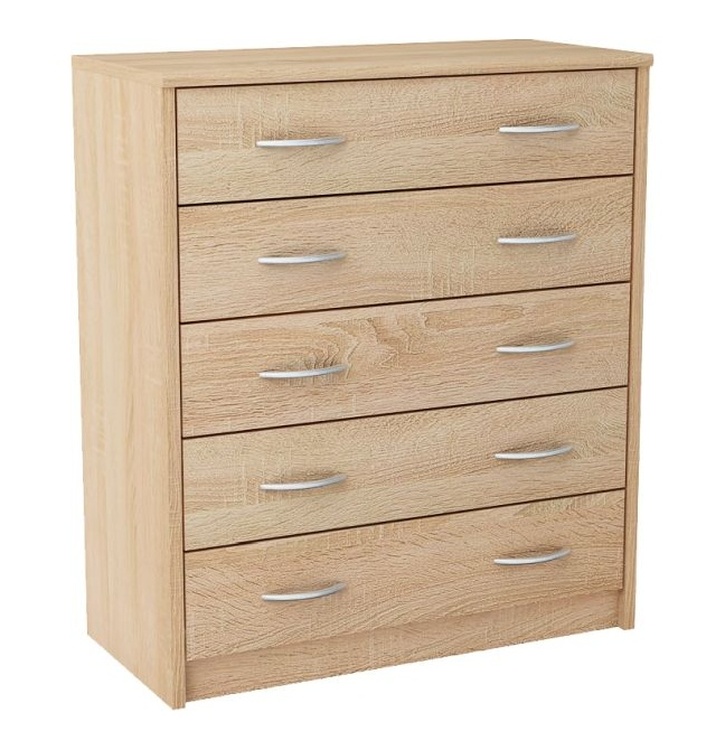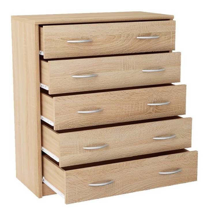 Komoda s 5 zásuvkami v moderním provedení. Korpus i dvířka jsou z kvalitní LTD v barvě dub sonoma. Lamino je odolné vůči vysokým teplotám, poškrábání a nárazům, hraněné ABS páskou. Jasně viditelná struktura dřeva. Pojezdy v zásuvkách jsou kovové s plastovými kolečky. Dodáváme v demontovaném stavu.CASA 53001
