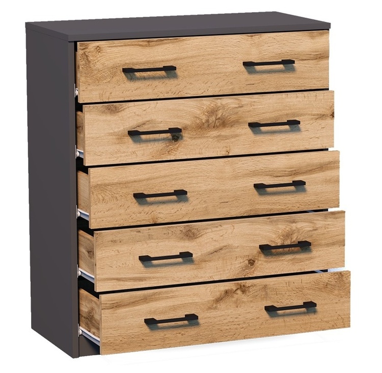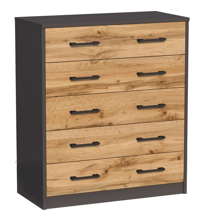 Komoda s 5 zásuvkami v moderním provedení. Korpus i dvířka jsou z kvalitní LTD, korpus v barvě grafit a dvířka v barvě dub wotan. Lamino je odolné vůči vysokým teplotám, poškrábání a nárazům, hraněné ABS páskou. Jasně viditelná struktura dřeva. Pojezdy v zásuvkách jsou kovové s plastovými kolečky. Dodáváme v demontovaném stavu.CASA 53001